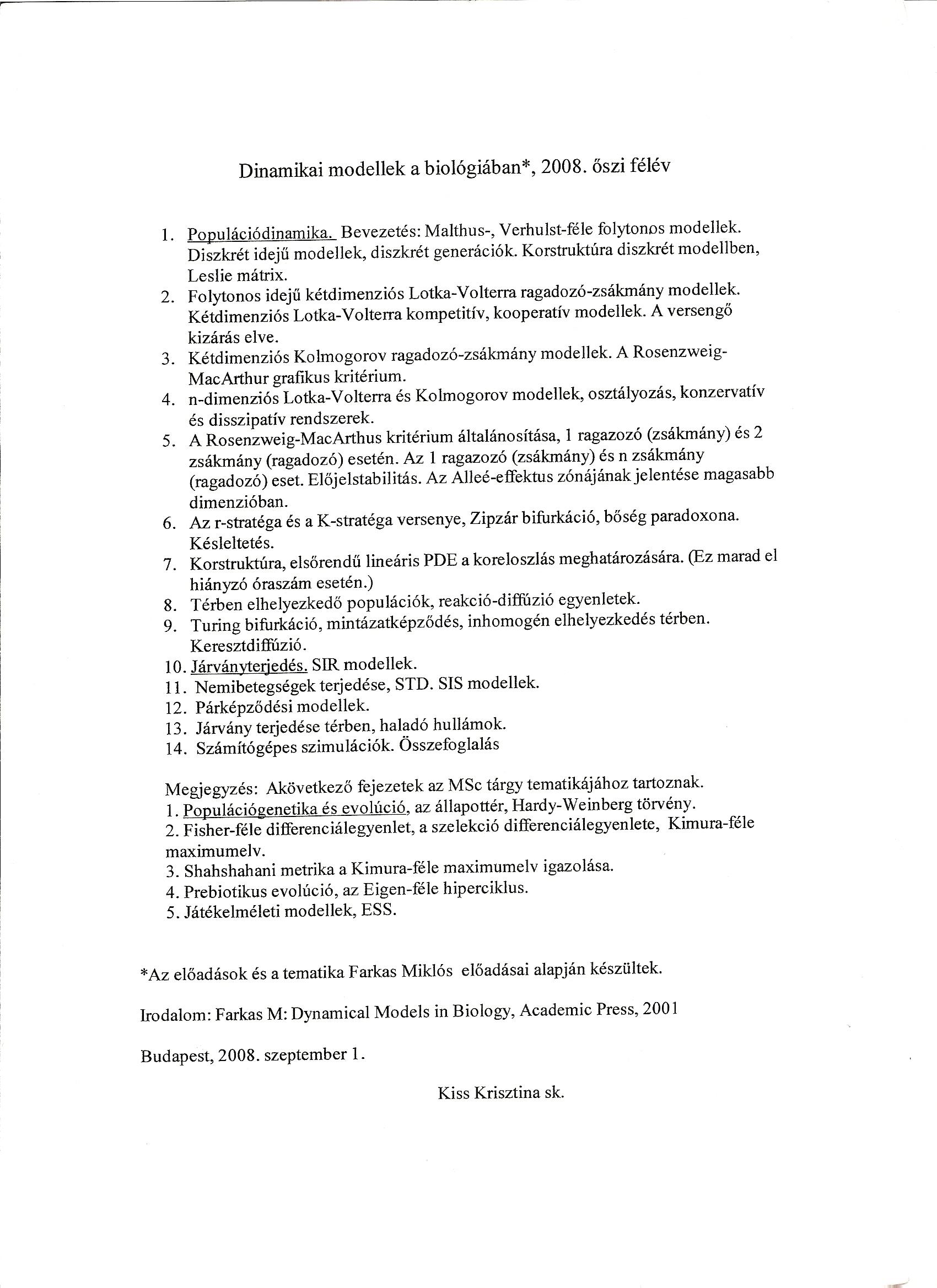 Dinamikai modellek a biológiában - tételsor