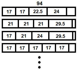- "Fill": Find the least filled sheet. If it's possible to add to it, then add the largest possible order size to it. Repeat until no more items can be added to any sheet. Add the new configurations to the possible patterns.